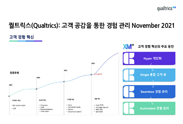 고객 및 직원 경험관리(XM: Experience Management) 분야의 선구자이자 리더 기업인 퀄트릭스는 고객, 직원, 제품, 브랜드 등 4대 비즈니스 핵심 경험을 관리 및 개선하는 경험관리 개념을 업계 최초로 제시했으며 해당 분야를 선도하고 있습니다. 한국 기업이 보다 향상된 고객 및 직원 경험을 설계해 의미있는 비즈니스 성과를 이끌어낼 수 있도록 지원하고 있습니다.